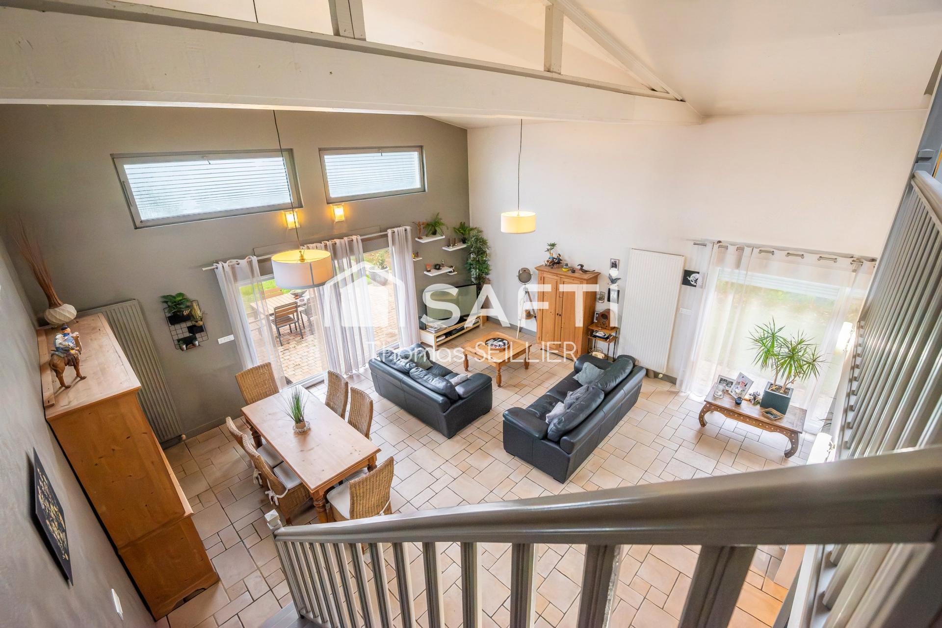 . Côté Jour : La pièce de vie baignée de lumière impressionne par ses volumes. Elle s'ouvre sur une cuisine moderne et fonctionnelle, sublimée par une verrière industrielle qui apporte caractère et perspective. Une grande buanderie et un WC avec lave-mains complètent cet espace.