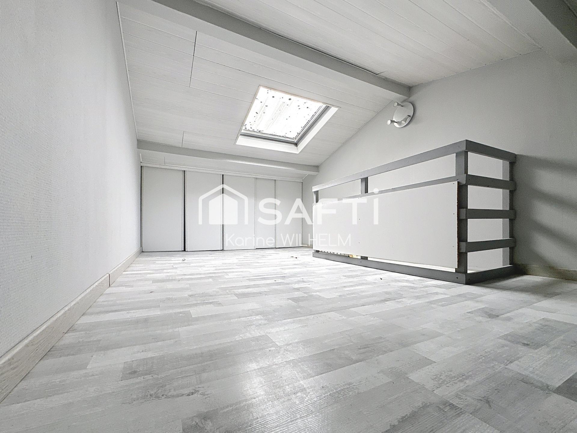 À l’étage, une chambre mansardée de 15 m² équipée de placards dressing optimise parfaitement l’espace.