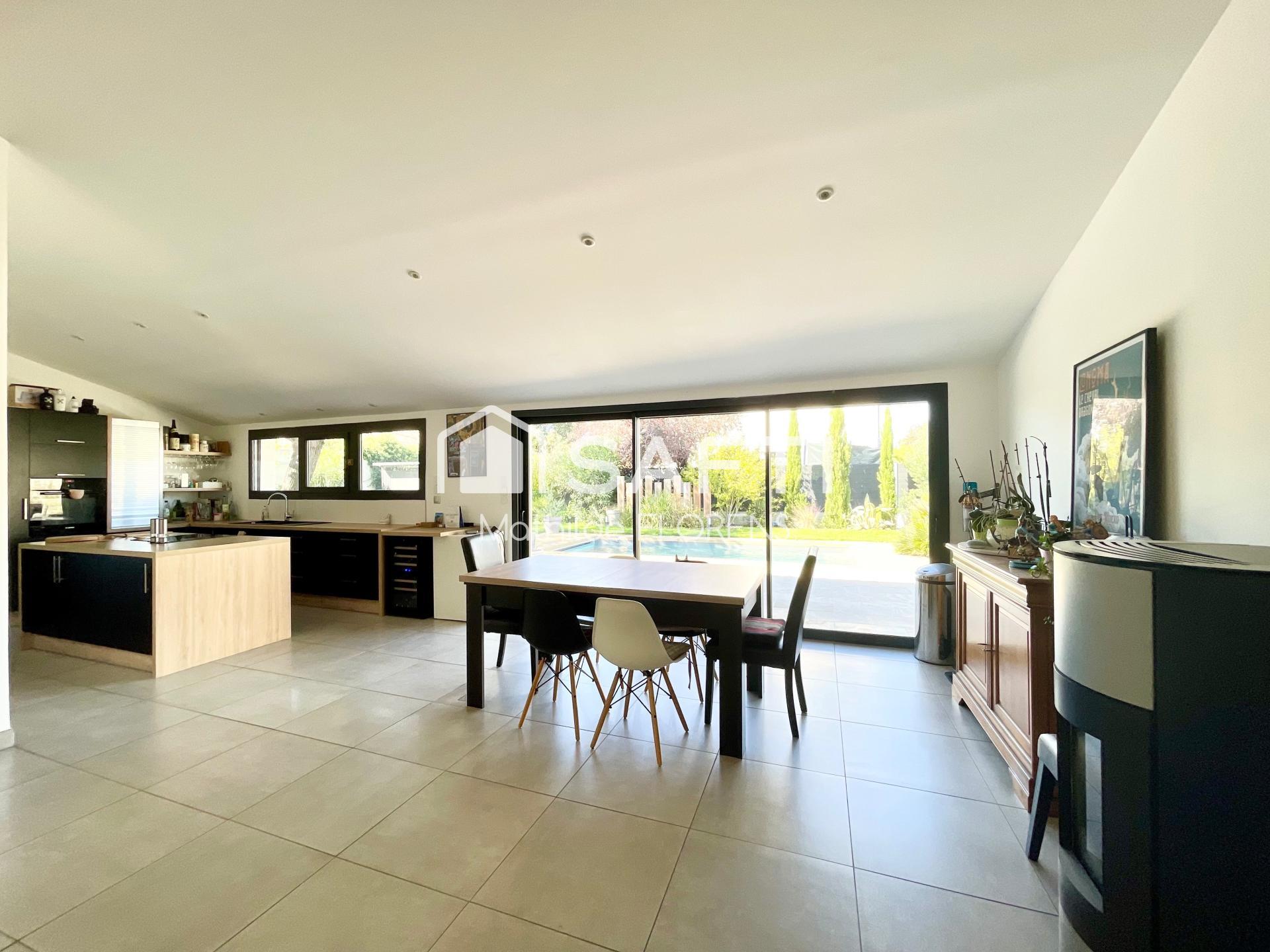 Développant environ 165 m2, la maison séduit dès l'entrée par une pièce de vie spectaculaire d'environ 70 m2, baignée de lumière, articulée autour d'un poêle à granulés et ouverte sur une terrasse conviviale avec piscine chauffée, sans vis-à-vis.