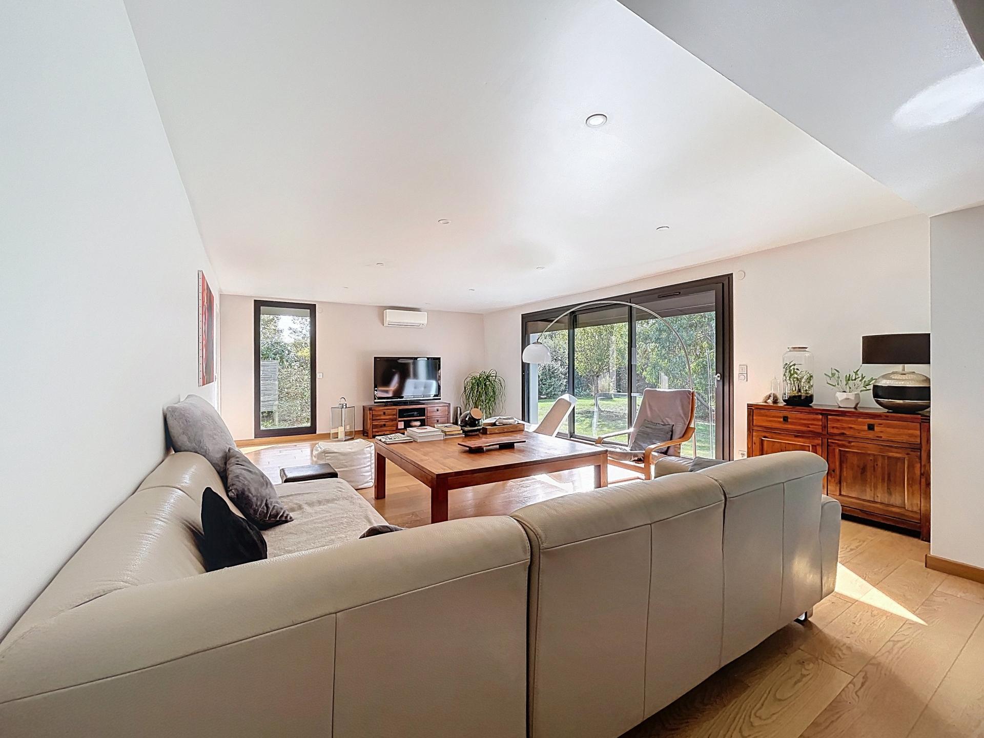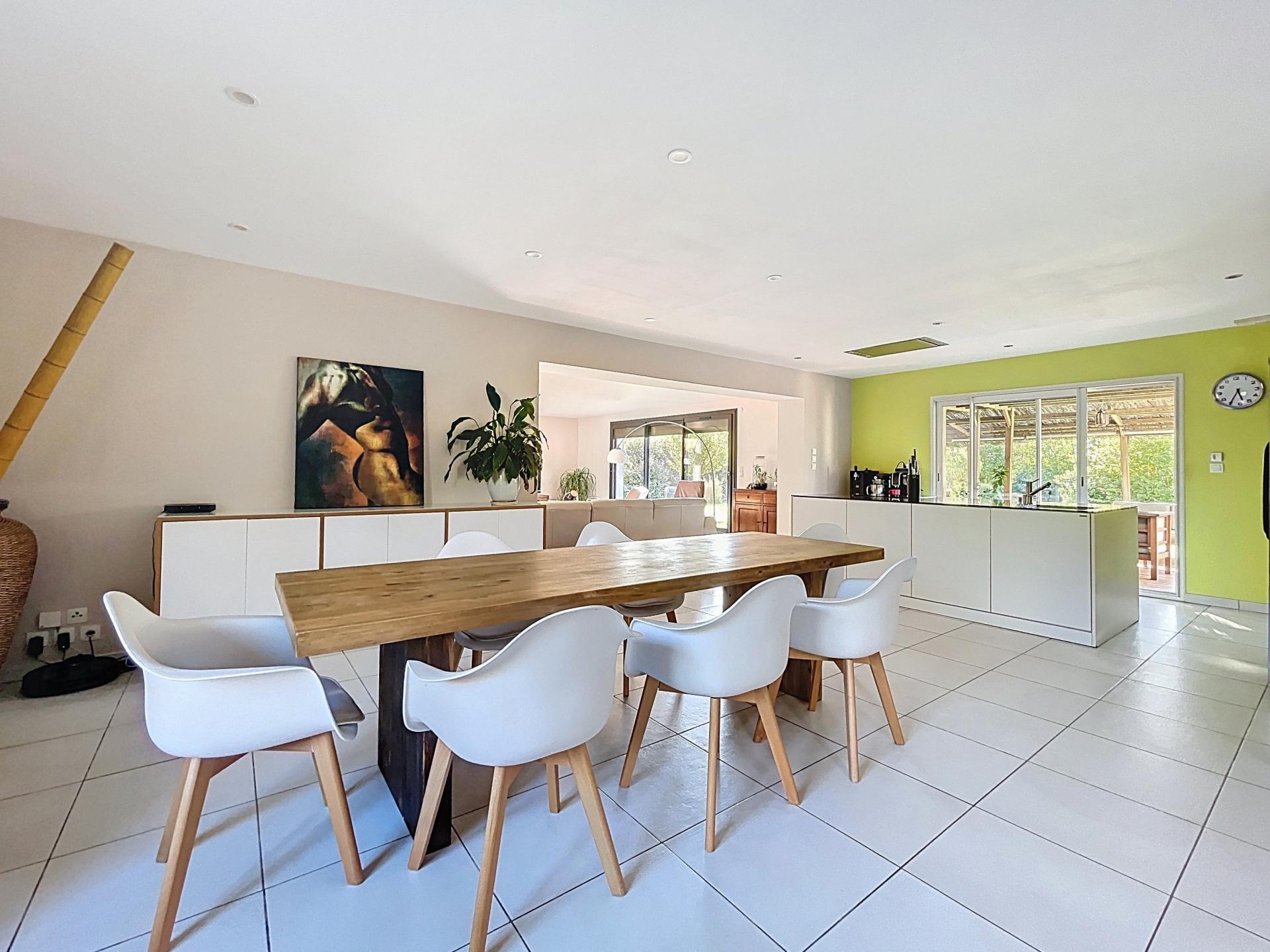 La pièce de vie de plus de 80 m² combine harmonieusement un salon convivial orienté sud et ouest avec grande baie vitrée, une salle à manger et une cuisine Siematic avec îlot central. Cette dernière s’ouvre directement sur une terrasse en bois, prolongement naturel de l’intérieur, agrémentée d’une pergola pour profiter des repas en plein air mais aussi d'un véritable salon pour se reposer ou prendre l'apéro, face au vaste jardin arboré et à la piscine.
