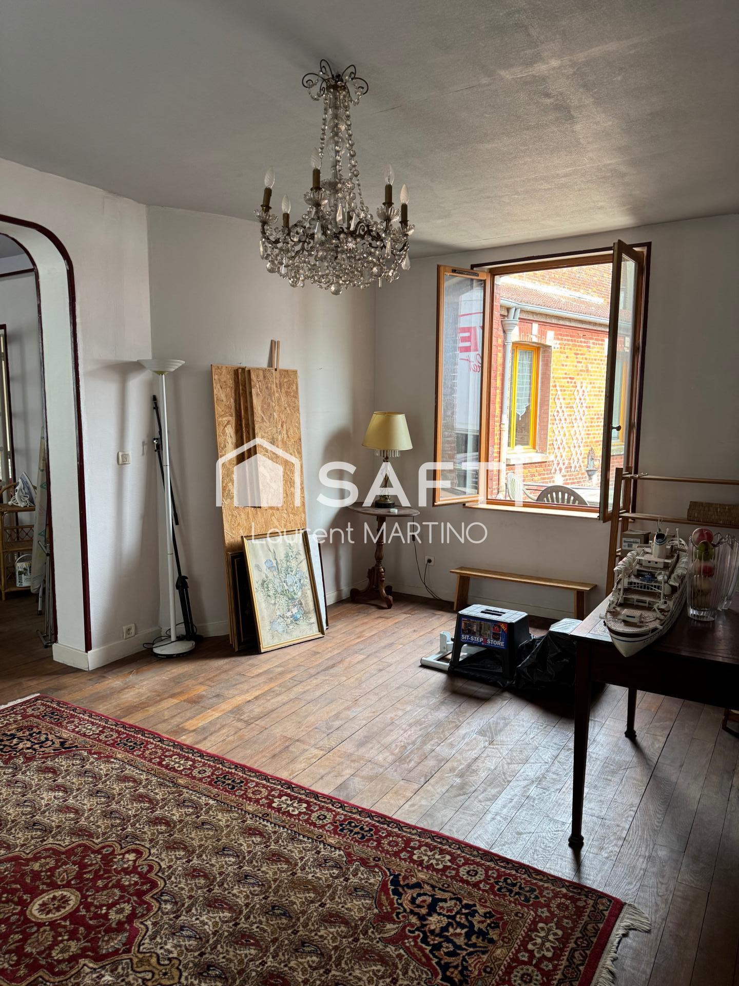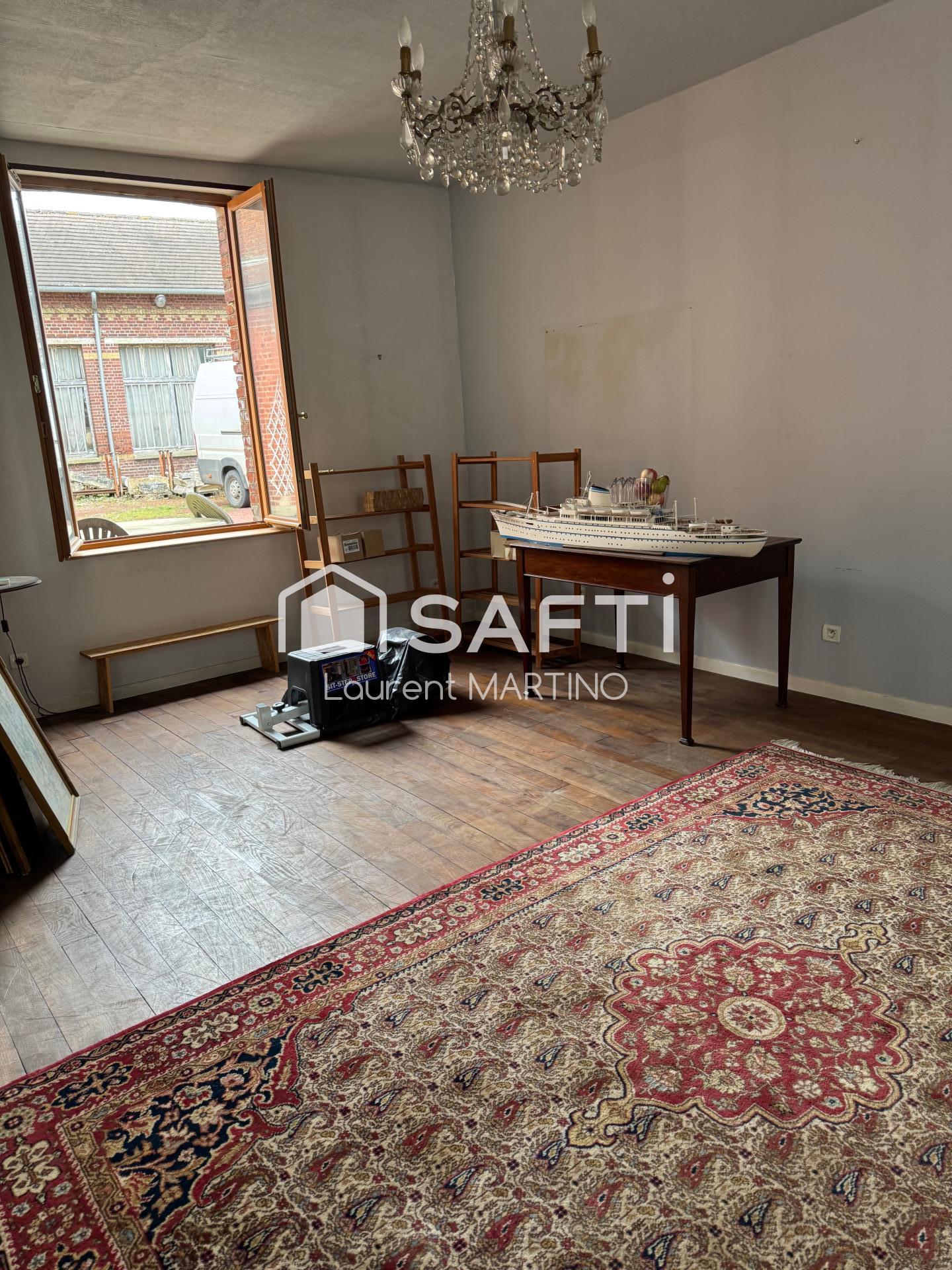 Située à Tricot (60420), Maison de 195m² a rafraichir: au rdc un halle d'entrée de 3m²,offrant un salon séjour de 42 m² attenant sur un autre salon de 17m², une cuisine de 18m², une chambre de 25m² et une une salle d'eau de 3m².