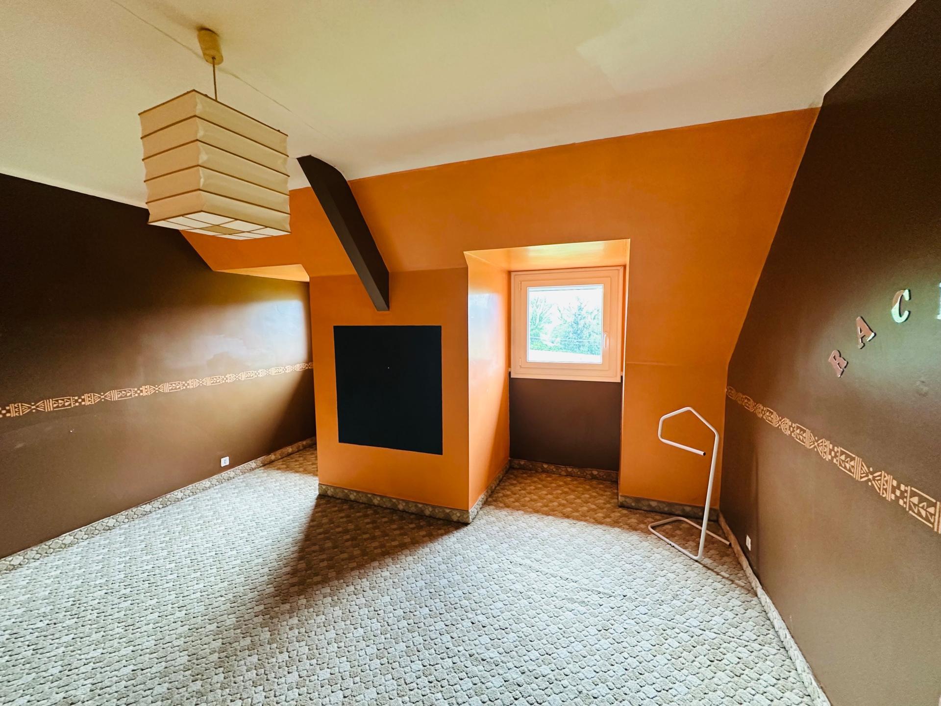 A l'étage, trois chambres spacieuses (12 et 18M2) et une très grande chambre avec une cheminée de 21M2, salle de douche avec WC, grenier aménageable.