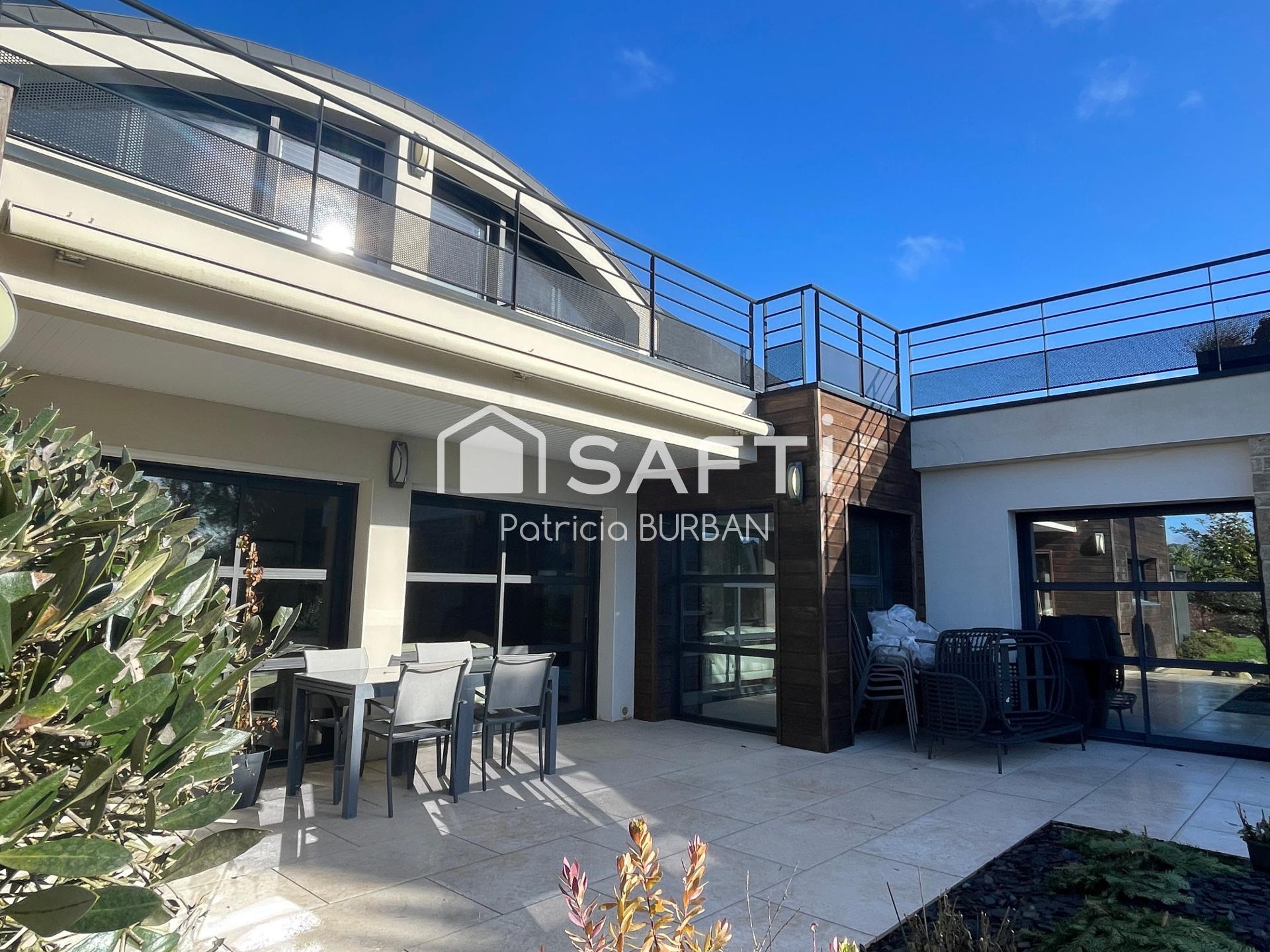 Dès l'entrée, un hall avec coin vestiaire et wc invités dévoile une vaste pièce de vie chaleureuse et baignée de lumière, une cuisine alliant design et fonctionnalité. Cette maison est pensée pour le confort de ses résidents avec une suite parentale, un dressing, un bureau ou chambre selon vos besoins, une buanderie ainsi qu'un double garage. A l'étage, deux grandes suites parentales chacune avec sa salle d'eau, une spacieuse mezzanine avec coin kitchenette donnant accès à un toit terrasse de plus de 60 m2 propice à la détente à ciel ouvert. De plus une piscine couverte et chauffée véritable atout bien être utilisable toute l'année dans un confort absolu. A l'extérieur, un jardin arboré et paysagé, offre un cadre naturel et intimiste avec grande terrasse exposées sud idéale pour profiter pleinement des beaux jours. Des prestations de qualités avec panneaux solaires , PAC, assainissement collectif, réserve d'eau pluviale. Un bien rare à découvrir sans tarder !
