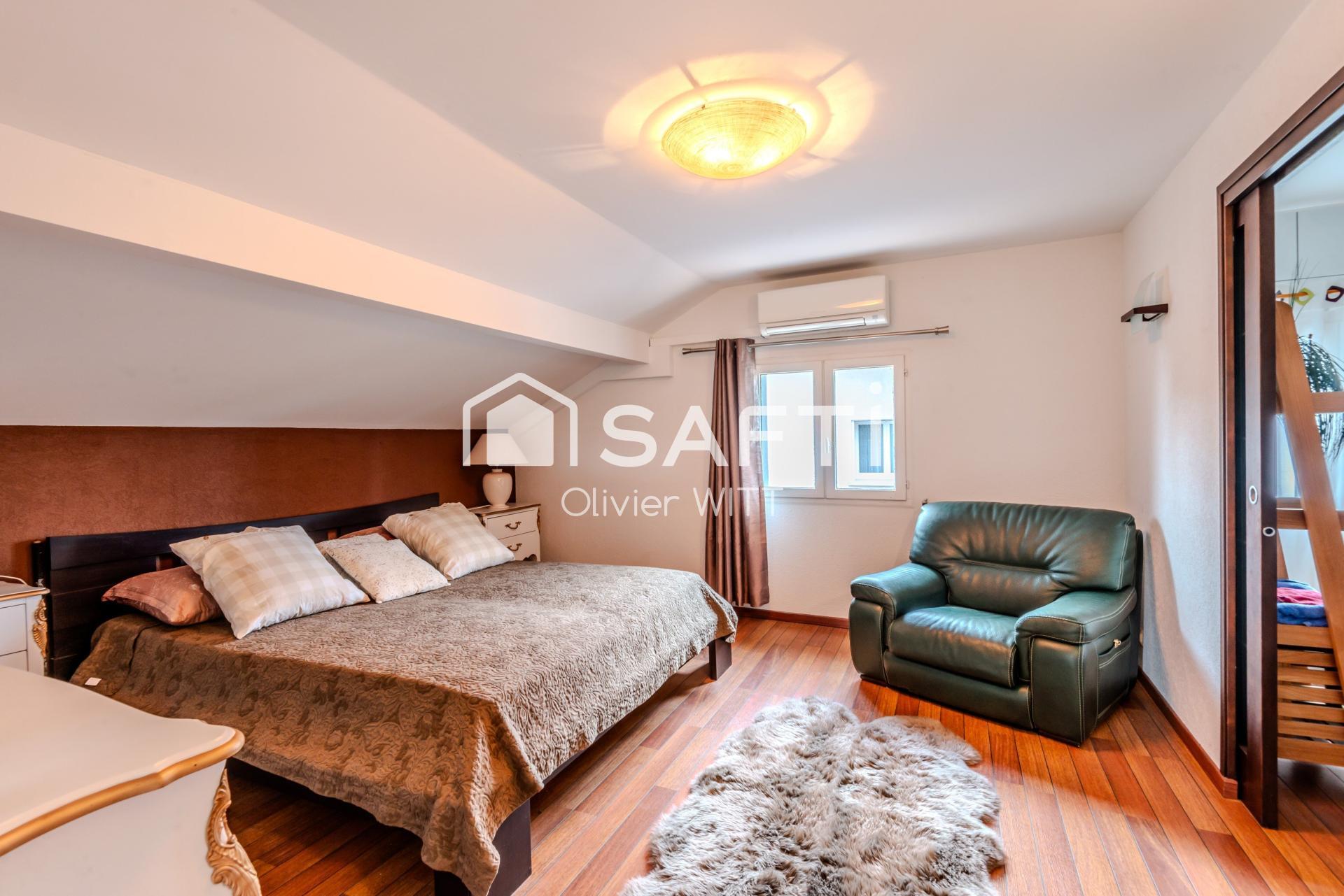 Au rez-de-chaussée, vous découvrirez une grande pièce à vivre baignée de lumière naturelle, grâce à ses larges ouvertures et son accès direct à la terrasse. La cuisine, entièrement équipée et aménagée, s’ouvre sur cet espace convivial, idéal pour recevoir. Deux grandes chambres avec leur salle d’eau, complètent ce niveau.