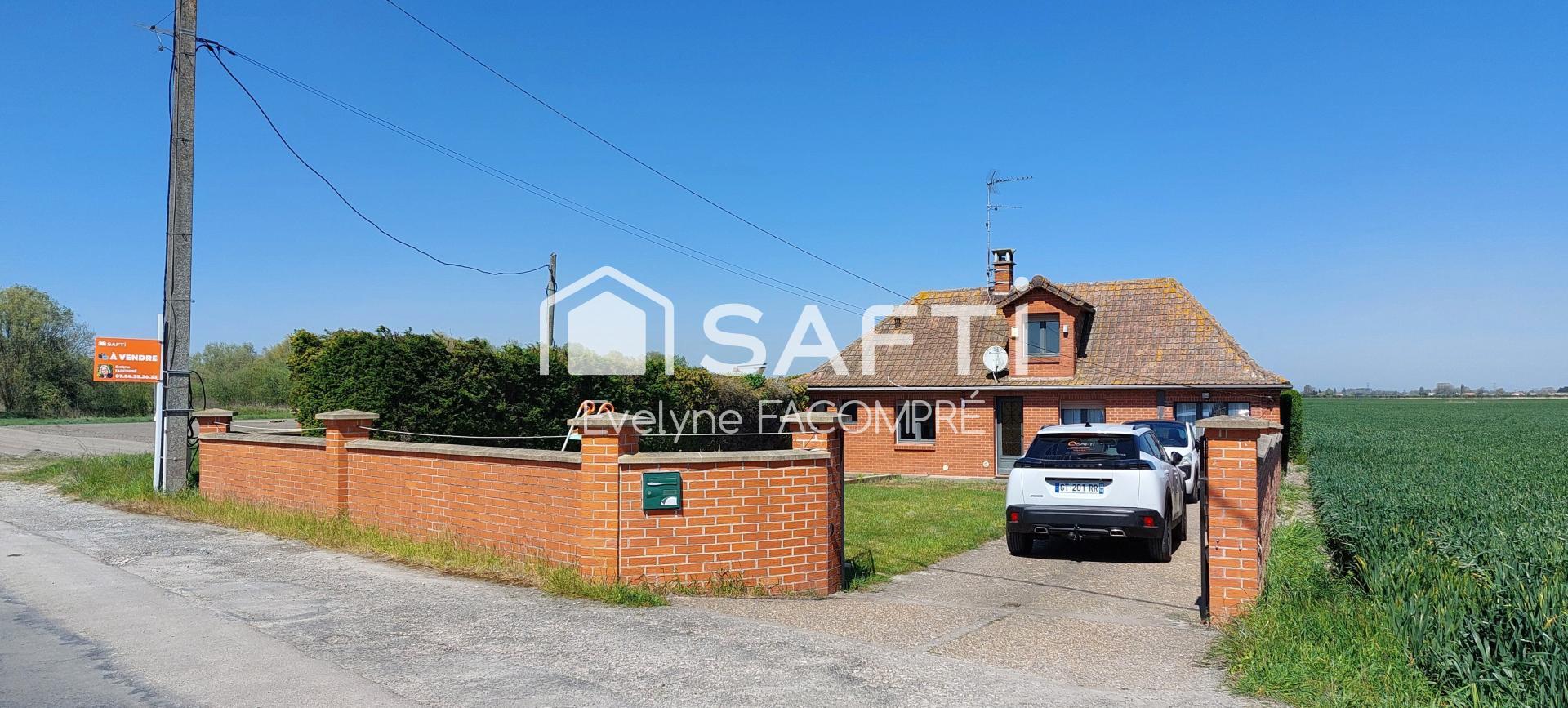 Maison individuelle semi plain-pied située en pleine campagne, dans un environnement calme avec vue sur les champs, à seulement 2 km des écoles, commerces et commodités.
