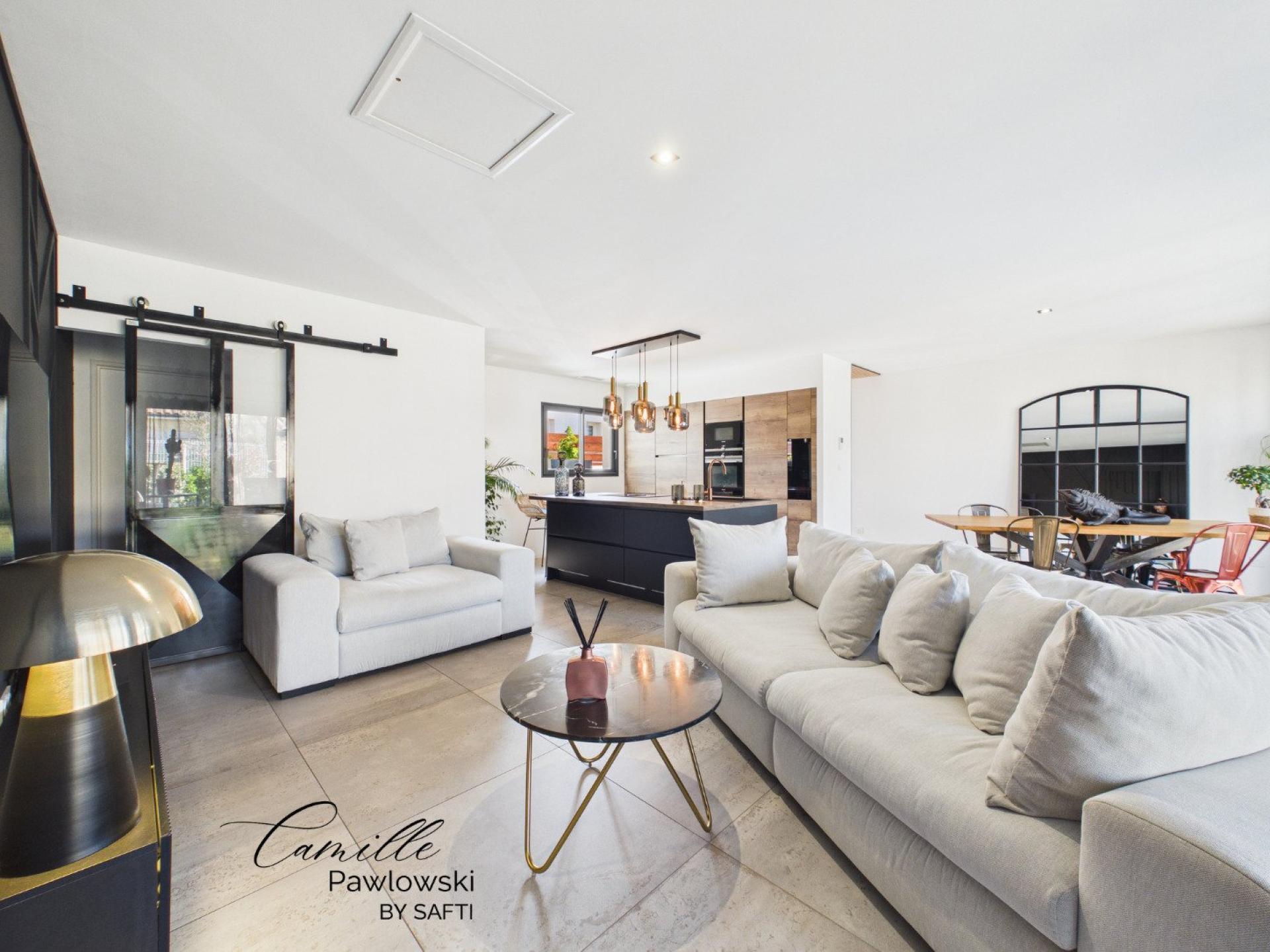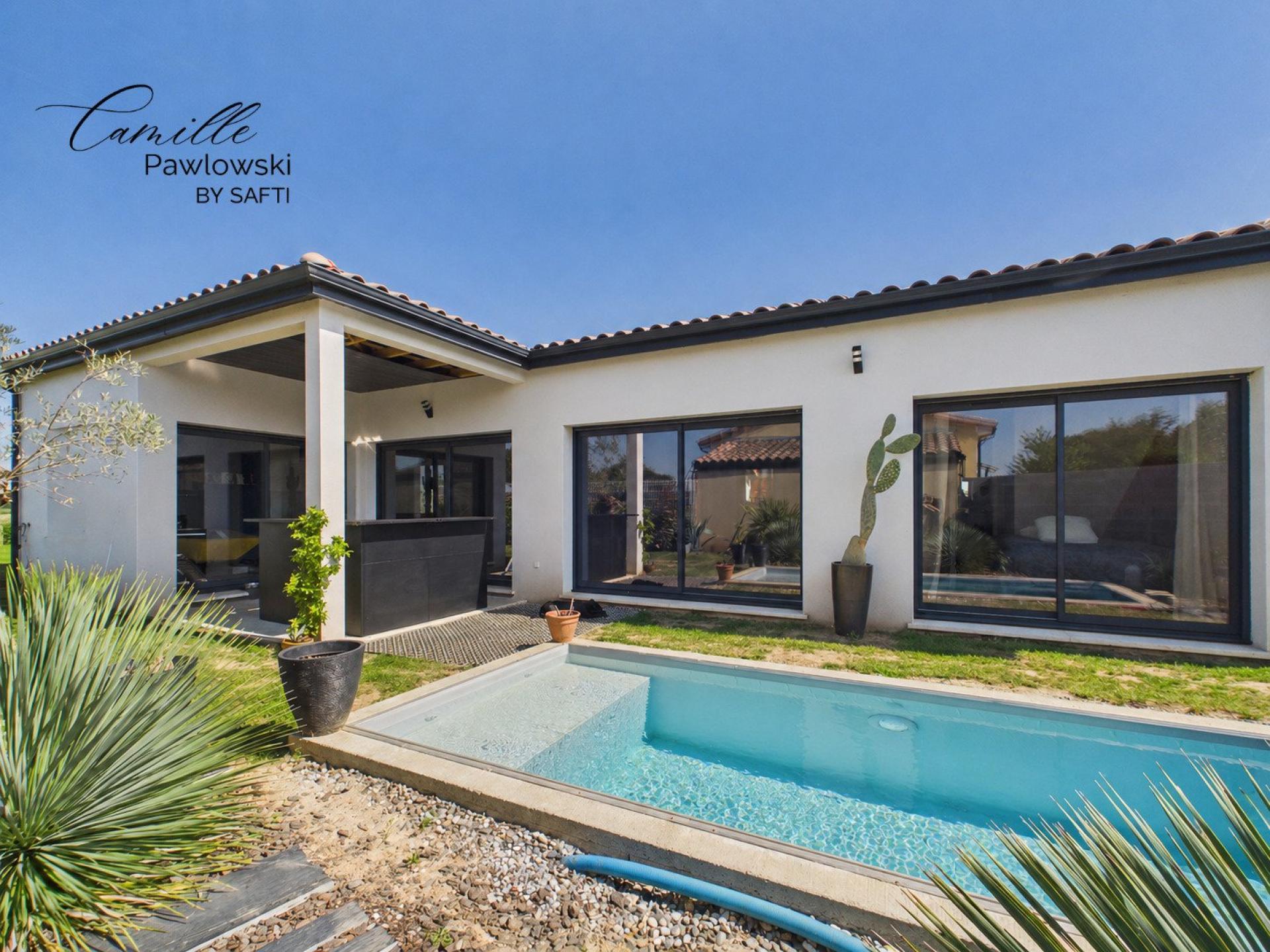 Maison contemporaine de plain-pied située dans une résidence calme, ce bien offre un cadre de vie confortable avec des prestations soignées. La pièce de vie lumineuse se compose d’un salon spacieux et d’une cuisine moderne entièrement équipée, pensée pour un usage quotidien fonctionnel. L’espace nuit comprend trois chambres, dont une suite parentale avec dressing et salle d’eau. Une seconde salle de bain complète l’ensemble. La maison dispose également d’une buanderie, de nombreux rangements ainsi que d’un garage de 20 m². Les matériaux et finitions apportent confort et modernité, sans travaux à prévoir. À l’extérieur, le jardin et la piscine privative permettent de profiter pleinement des espaces extérieurs. Ce bien réunit fonctionnalité, volumes agréables et environnement résidentiel de qualité, idéal pour une vie de famille dans un secteur paisible.