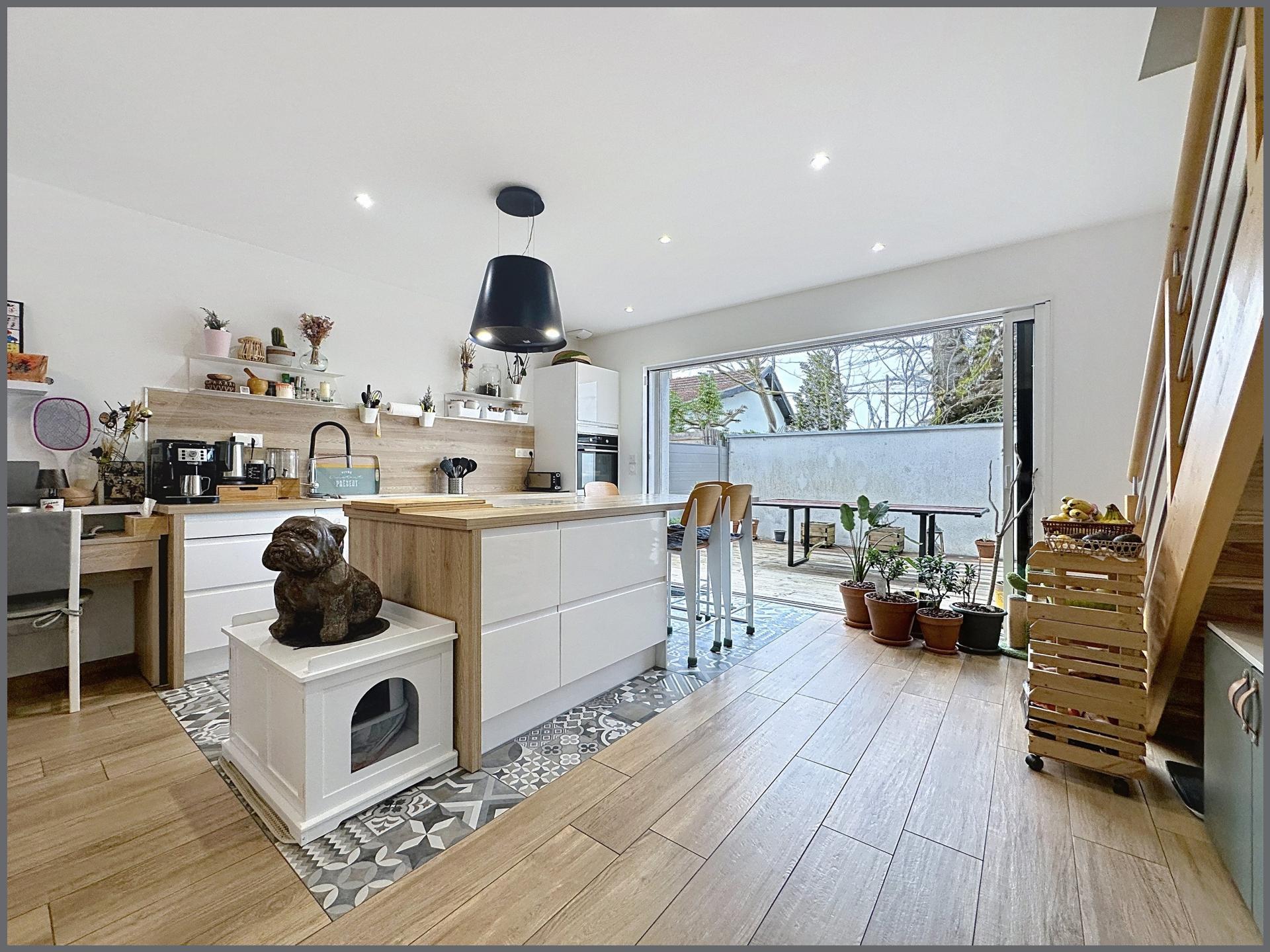 Au rez-de-chaussée, vous découvrirez une entrée ouvrant sur un séjour lumineux, une cuisine ouverte entièrement équipée avec accès direct à la terrasse grâce à une grande baie vitrée à galandage, ainsi qu’un cellier/buanderie attenant. Un WC indépendant complète ce niveau.