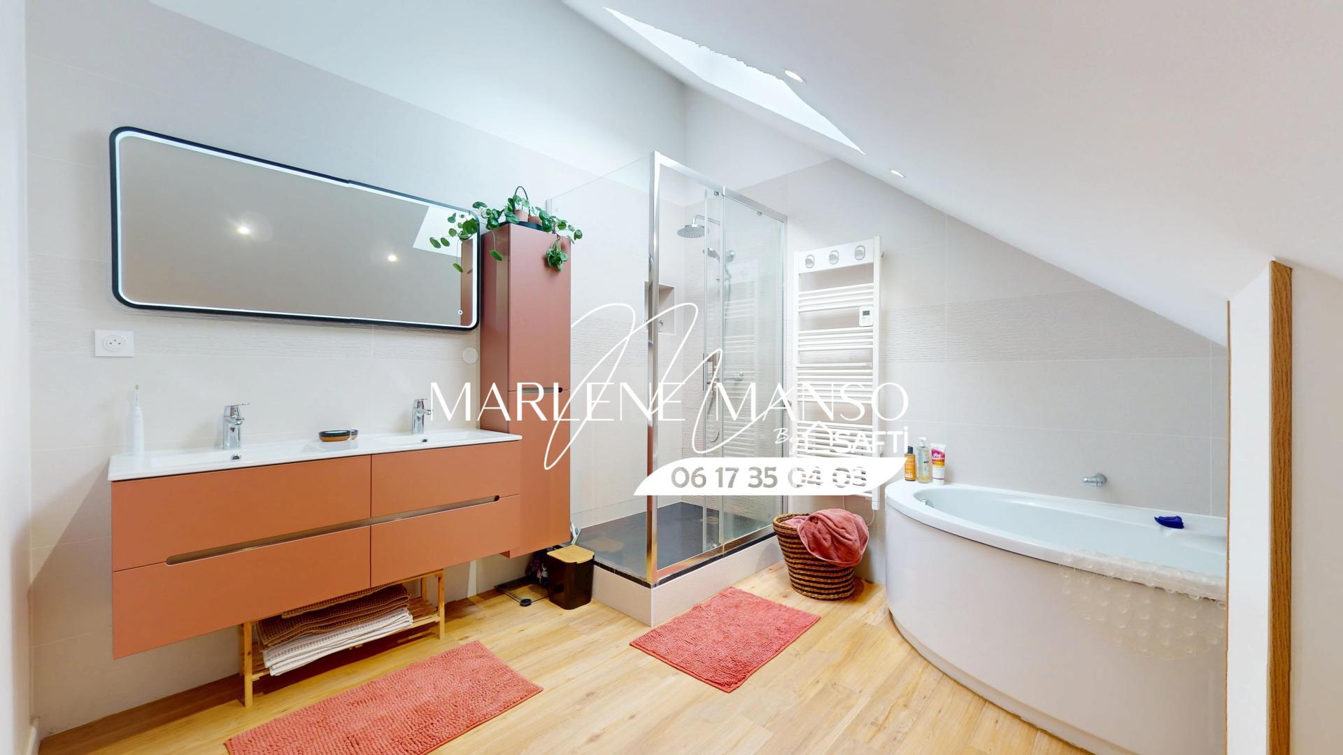 A l'étage, l'étage nuit propose 2 chambres confortables ainsi qu’une salle de bain ( douche et baignoire) récemment rénovée avec goût, offrant un design contemporain et des finitions soignées.