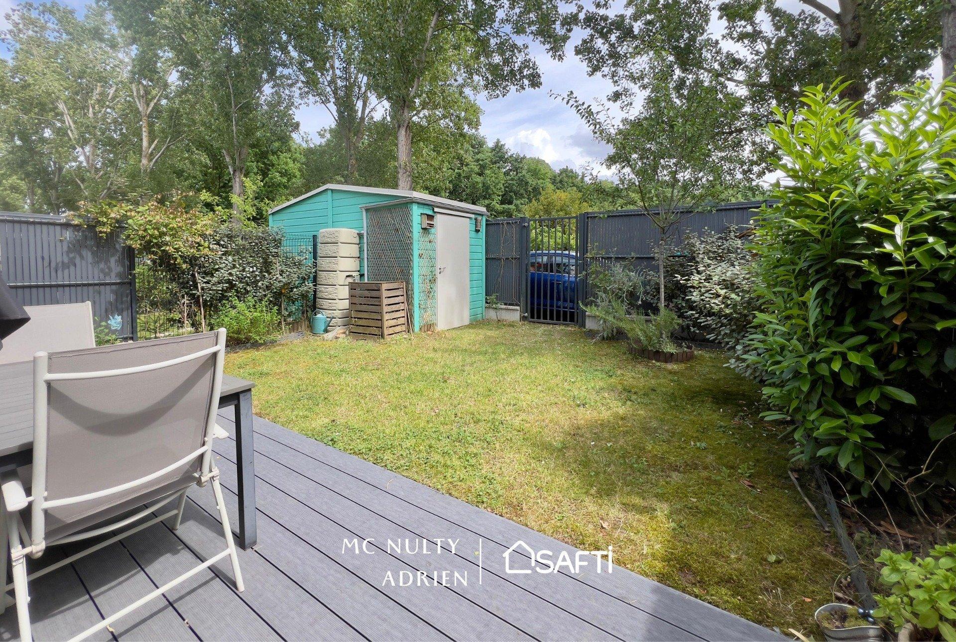 Une entrée donnant sur une salle d'eau avec WC suspendu, un salon-séjour lumineux s'ouvrant sur une cuisine semi-ouverte aménagée et équipée. Vous profiterez également d'une terrasse et d'un jardin avec cabanon, le tout sans vis-à-vis !