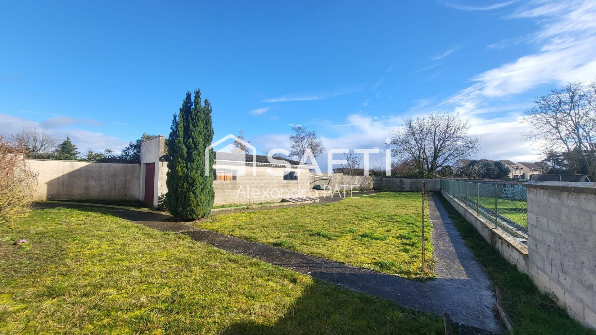 Maison à niveau unique avec sous-sol total, garage et chenil, grand terrain de 794 m², proche écoles, commerces et gare SNCF