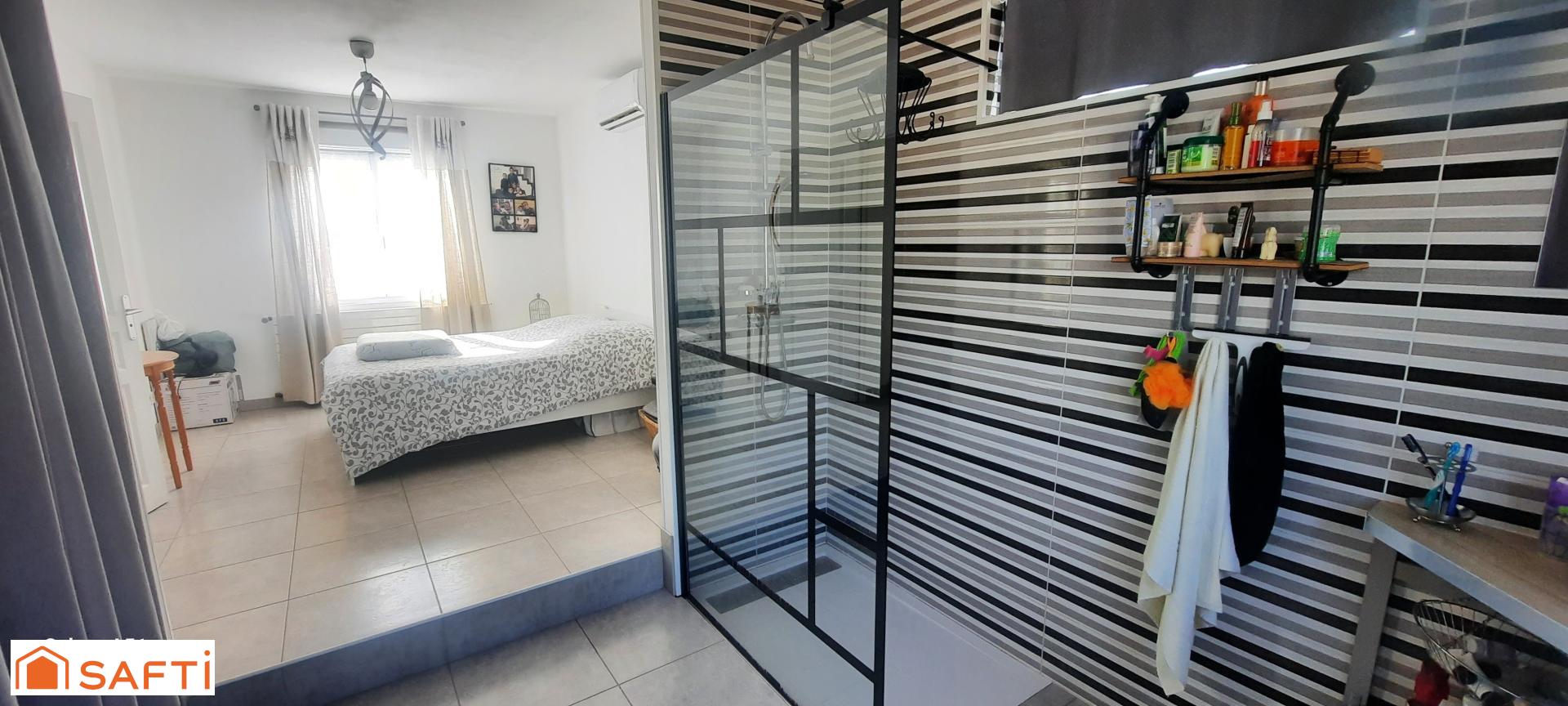 À l'intérieur, cette maison de 90 m² se compose d'une belle pièce de vie donnant sur une véranda plein sud, cuisine aménagée, 2 chambres dont une suite parentale, 2 salles d'eau et de 2 toilettes. Avec sa pompe à chaleur et son ballon thermodynamique de 270 litres, elle bénéficie d'un très bon diagnostic énergétique