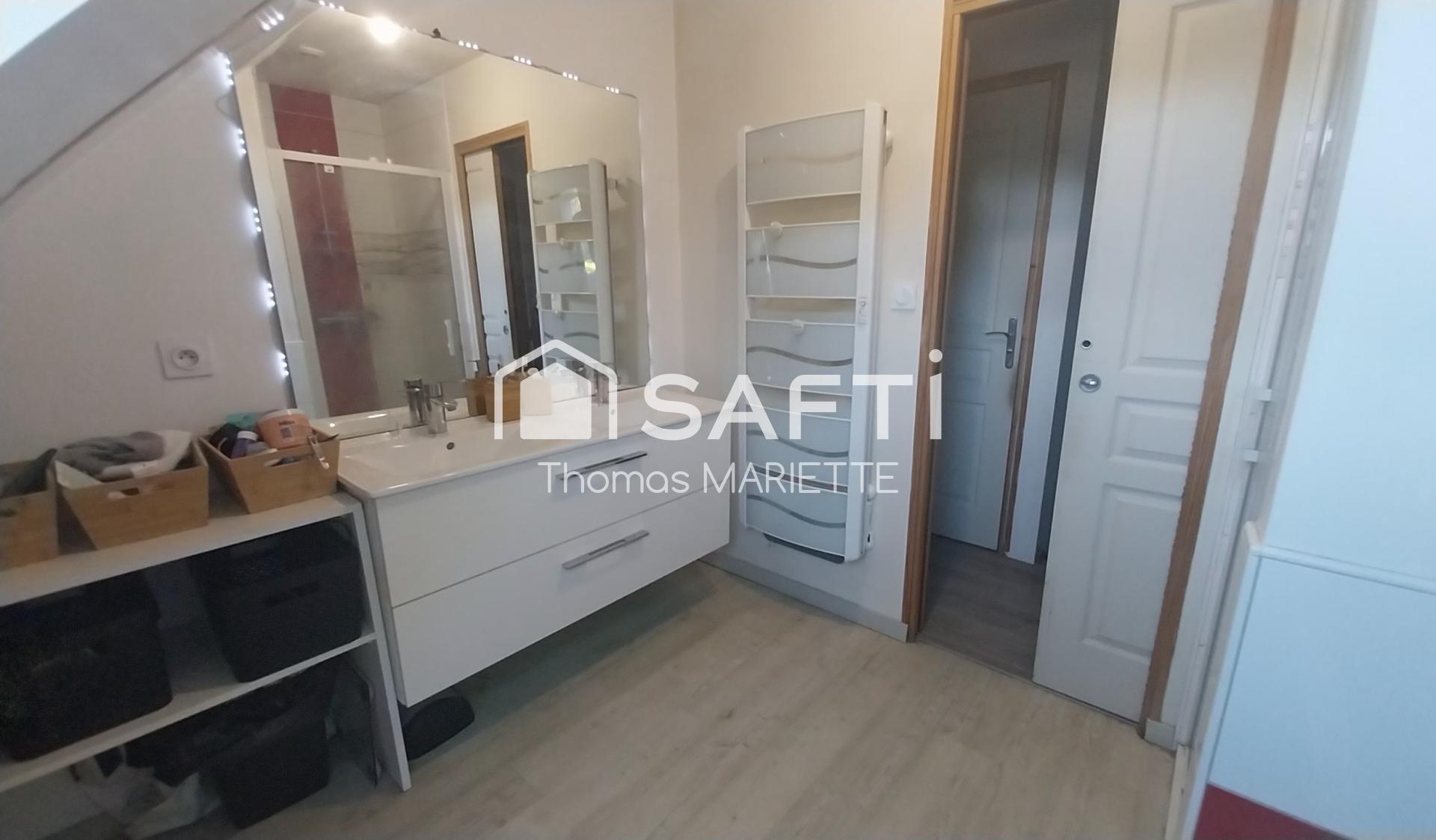 À l'étage, on trouve deux chambres mansardées, une salle de bain avec douche et double vasque, ainsi qu'un deuxième WC séparé. Le bien dispose d'un assainissement sans travaux.