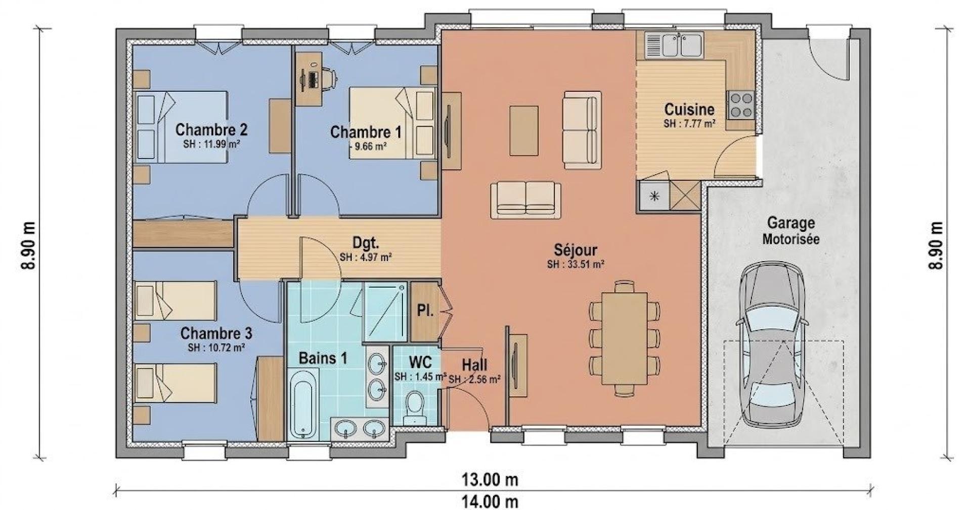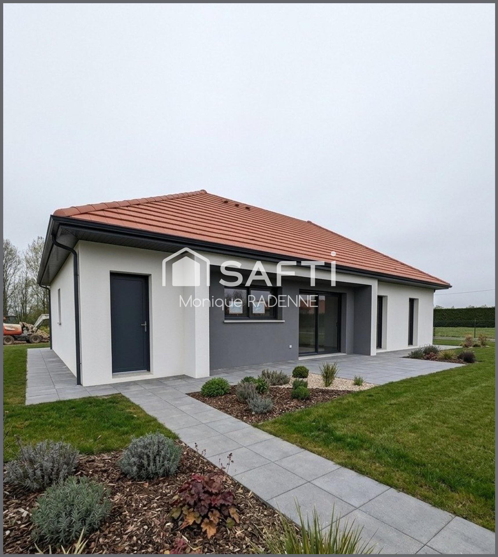 Cette maison individuelle de 90 m² de plain pied en cours de construction, se compose d'une cuisine ouverte sur séjour de 34 m² environ très lumineux, 3 chambres, 1 salle de bains, WC, accès direct de la maison au garage.