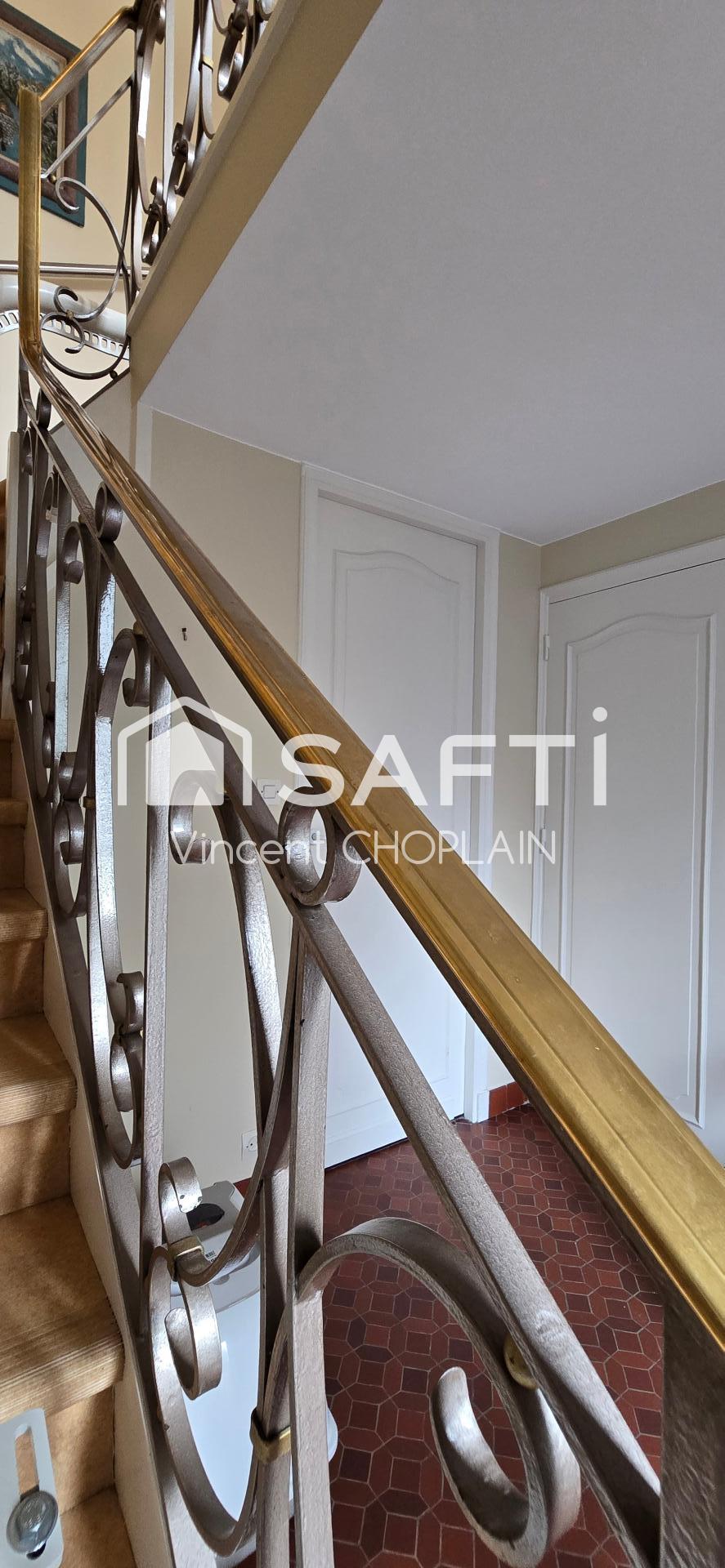 Un jardinet en façade mène à une entrée spacieuse. Un bel escalier avec une élégante rampe en fer forgé conduit au premier étage, ou un palier distribue un séjour lumineux en L, une cuisine équipée et un WC .