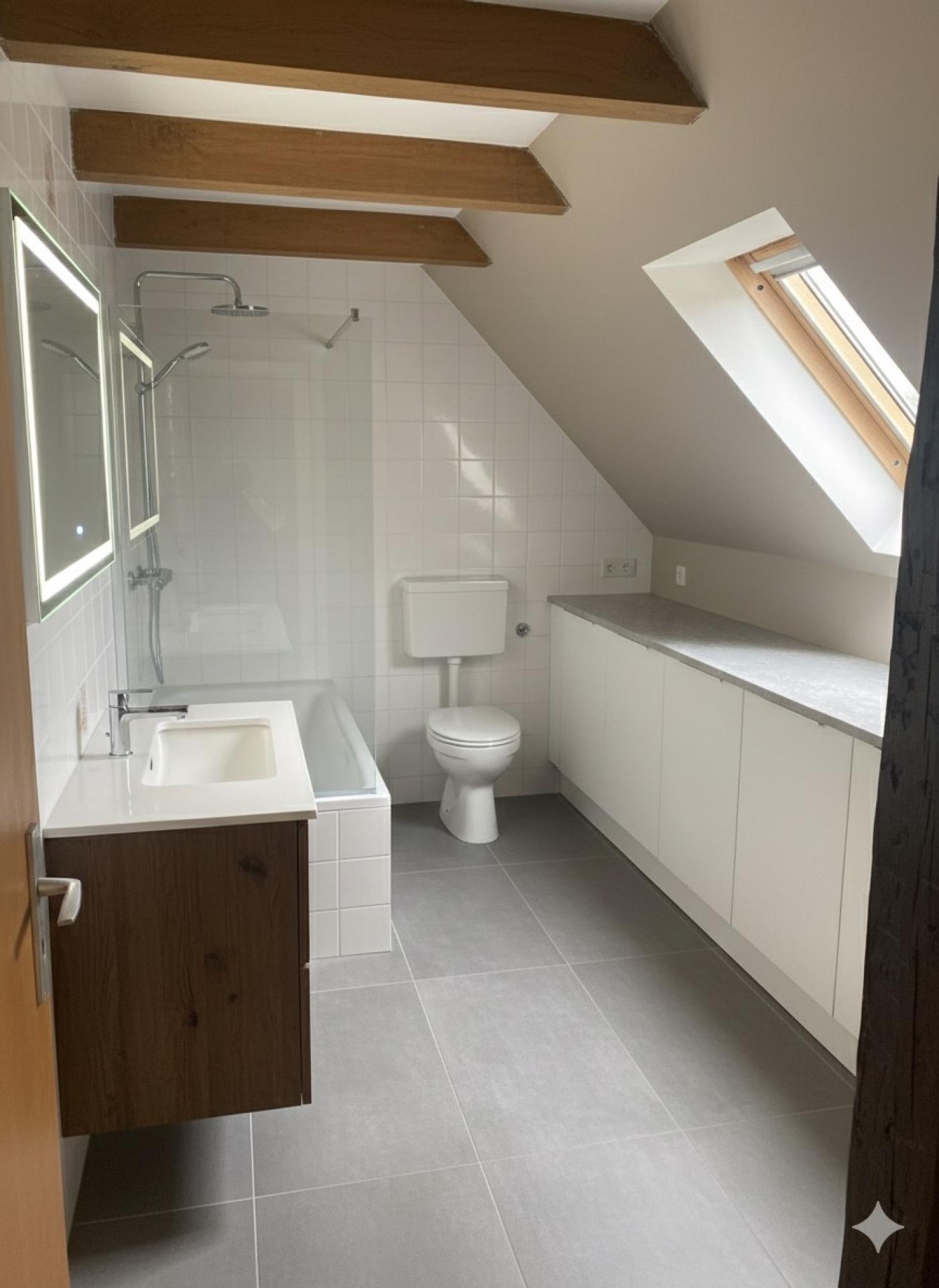 Au 1er étage: 1 chambre, 1 salle de bain avec WC, un accès grenier (isolé) pouvant être aménagé en chambre