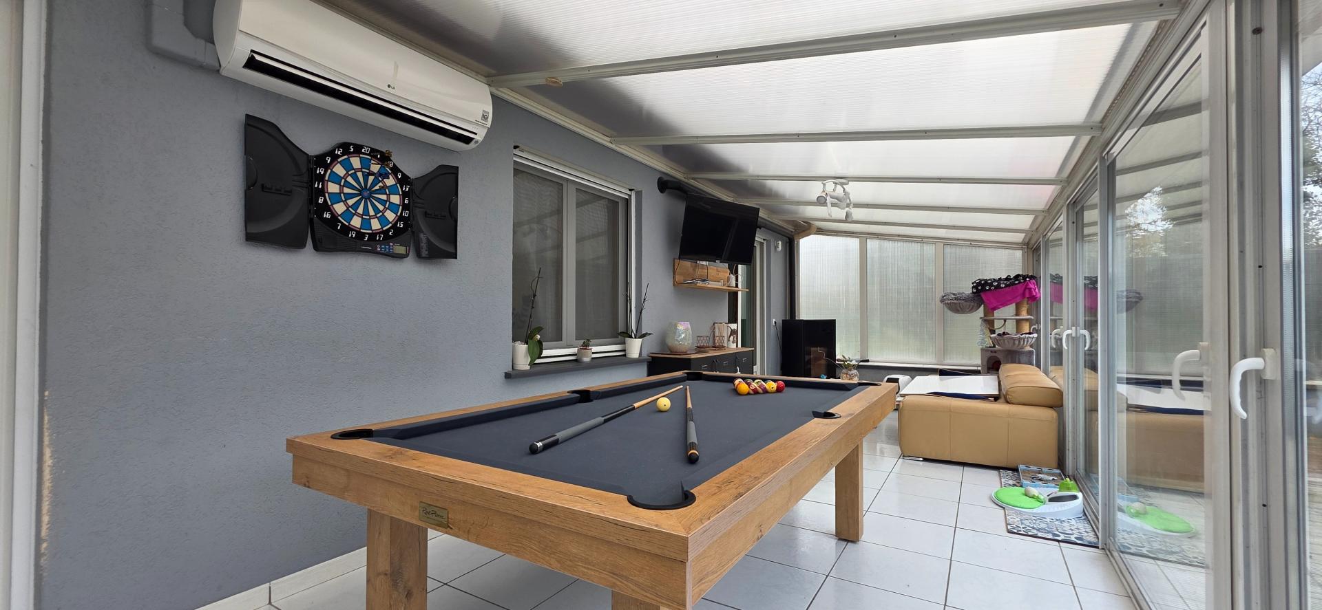 Dès l’entrée, on découvre une grande pièce de vie lumineuse à l’atmosphère chaleureuse, une cuisine entièrement équipée ouverte sur une véranda chauffée avec poel à granulé , idéale comme salon d’hiver ou espace détente.