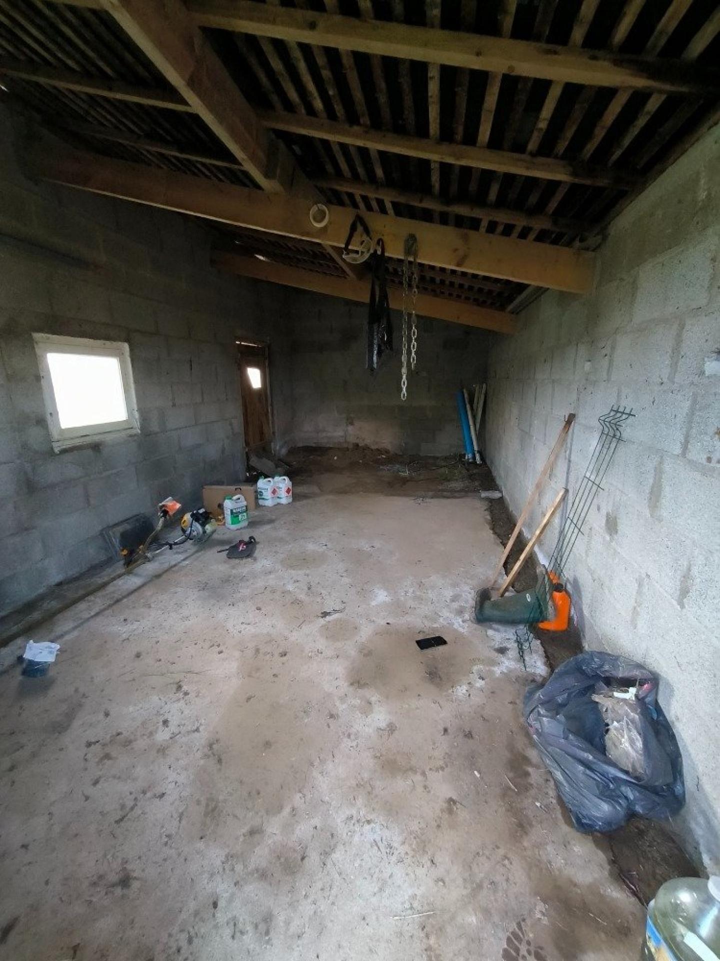 Terrain clos constructible avec garage en parpaing sous ardoises d'environ 22 m².