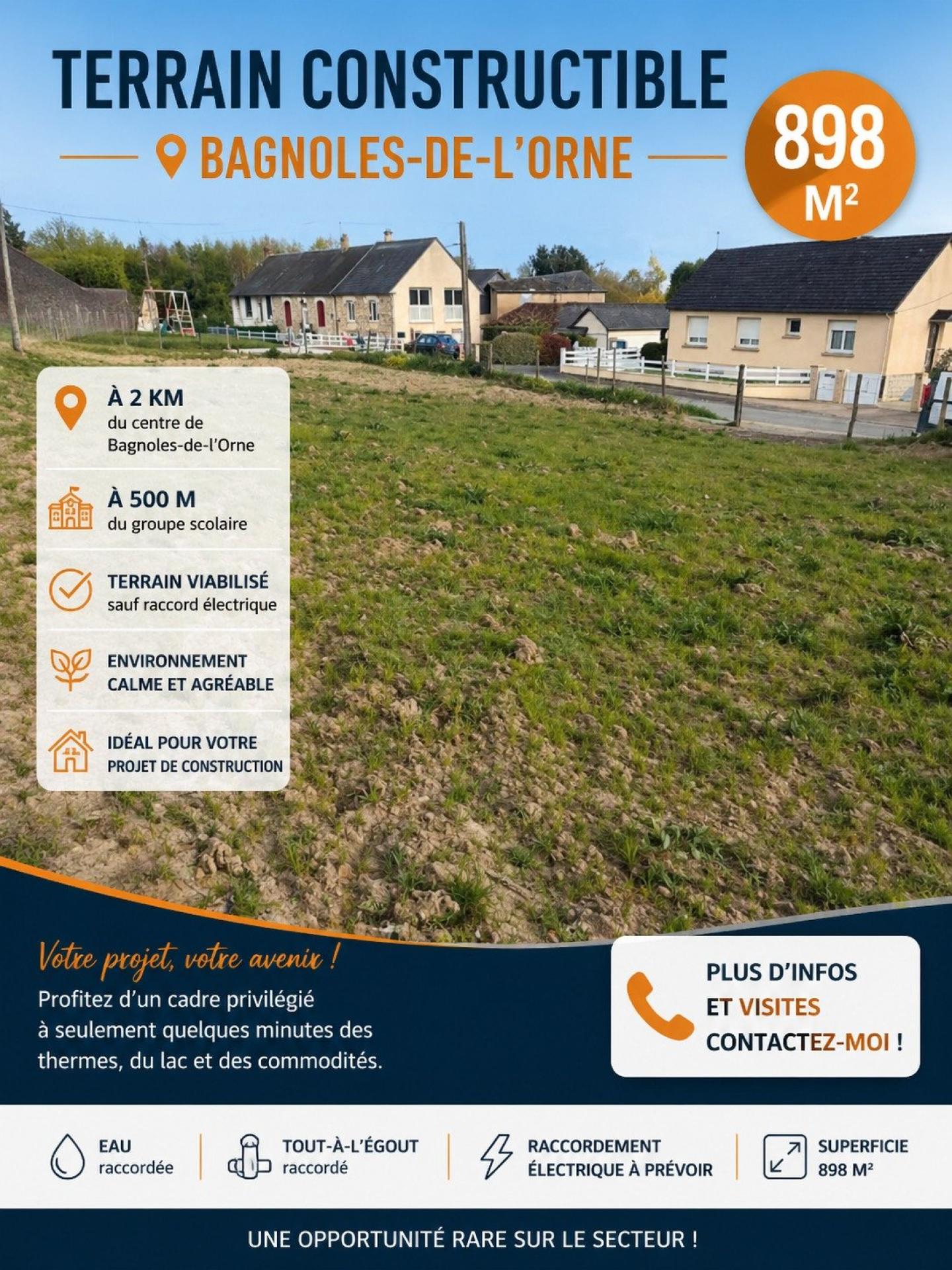 Terrain 898 m² viabilisé, au calme, à 2 km de Bagnoles et 500 m des écoles. Idéal pour votre projet de construction.