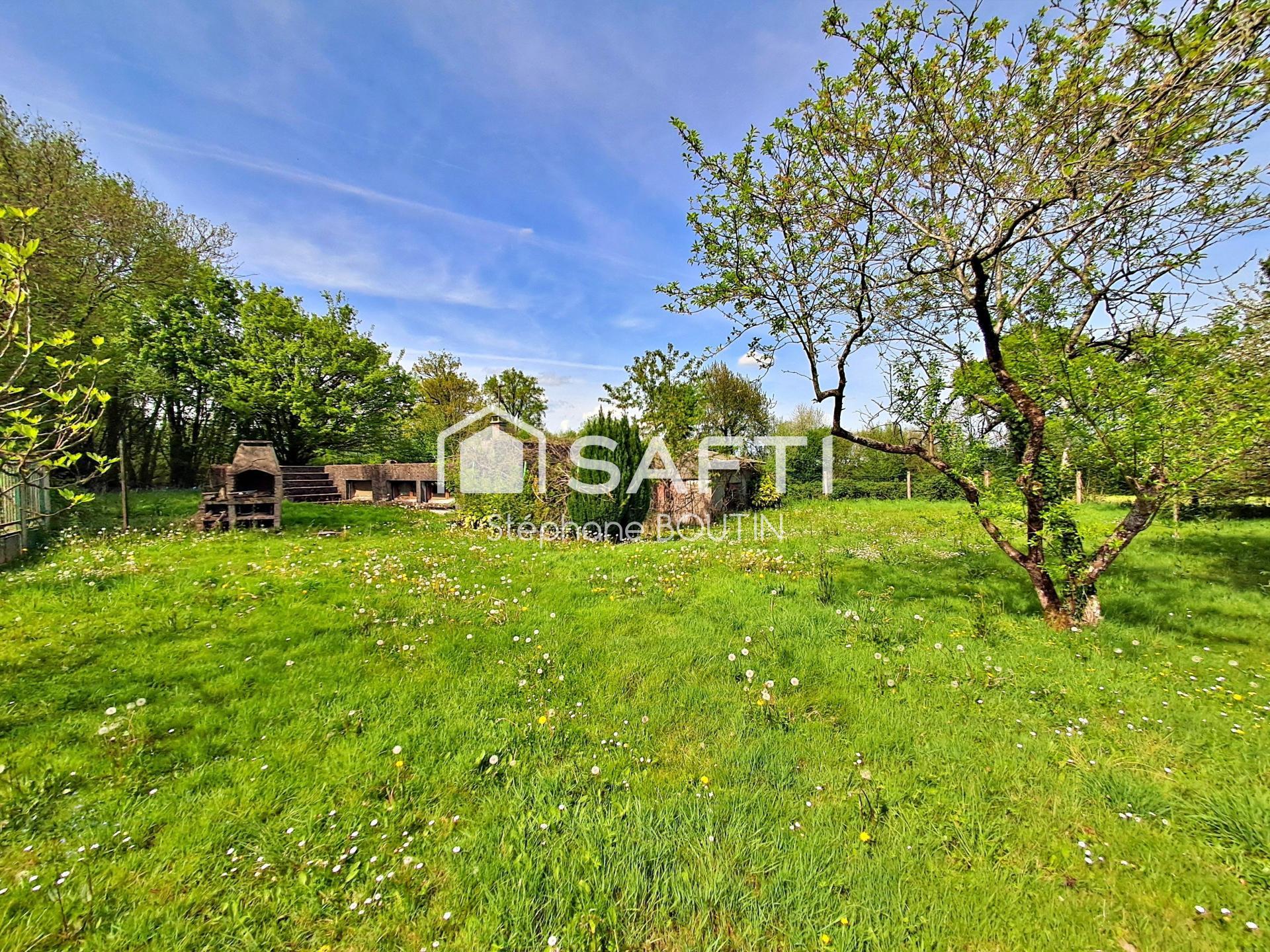 Le terrain est arboré avec plusieurs arbres fruitiers et une partie boisée, offrant des zones d’ombre agréables. Une grande surface en pelouse permet les activités de plein air, jeux ou pique-nique.