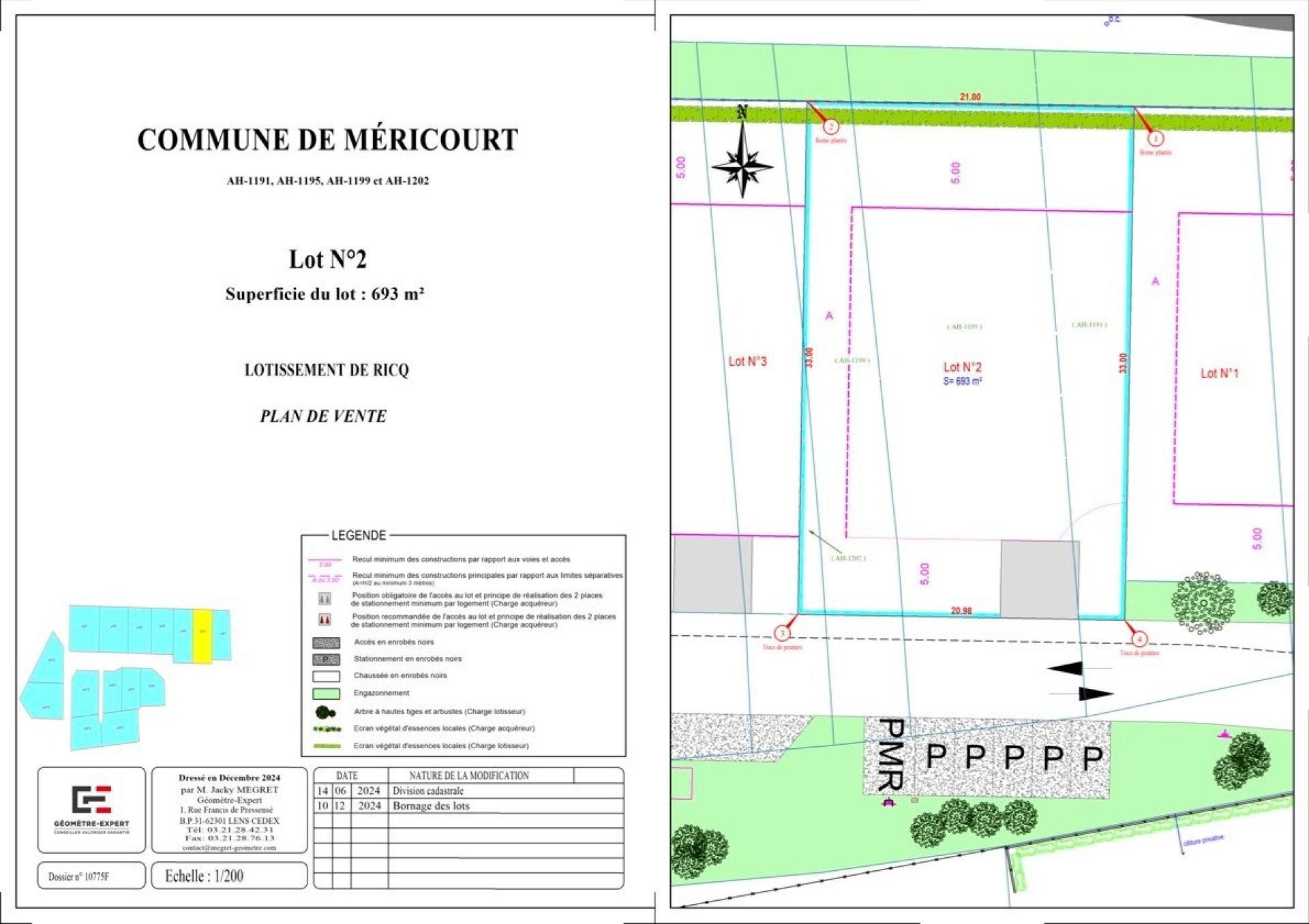 Situé dans la charmante ville de Méricourt (62680), ce terrain de 693 m² bénéficie d'un emplacement idéal au sein d'un lotissement résidentiel recherché, parcelle N2 . Méricourt, réputée pour son cadre de vie paisible et familial, offre un équilibre parfait entre tranquillité et accès facile aux commodités essentielles telles que les écoles, commerces et espaces verts.